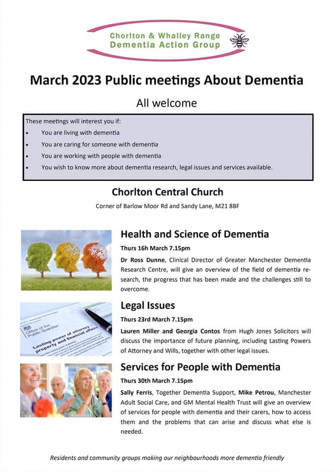 The Chorlton and Whalley Range Dementia Action Group is run by members of the local community. The group provides support and practical advice to anyone living with dementia and their family and carers. During March they're holding a number of information sessions for you to get involved with. Topics include the health and science of dementia, dealing with legal issues, and services for people with dementia.