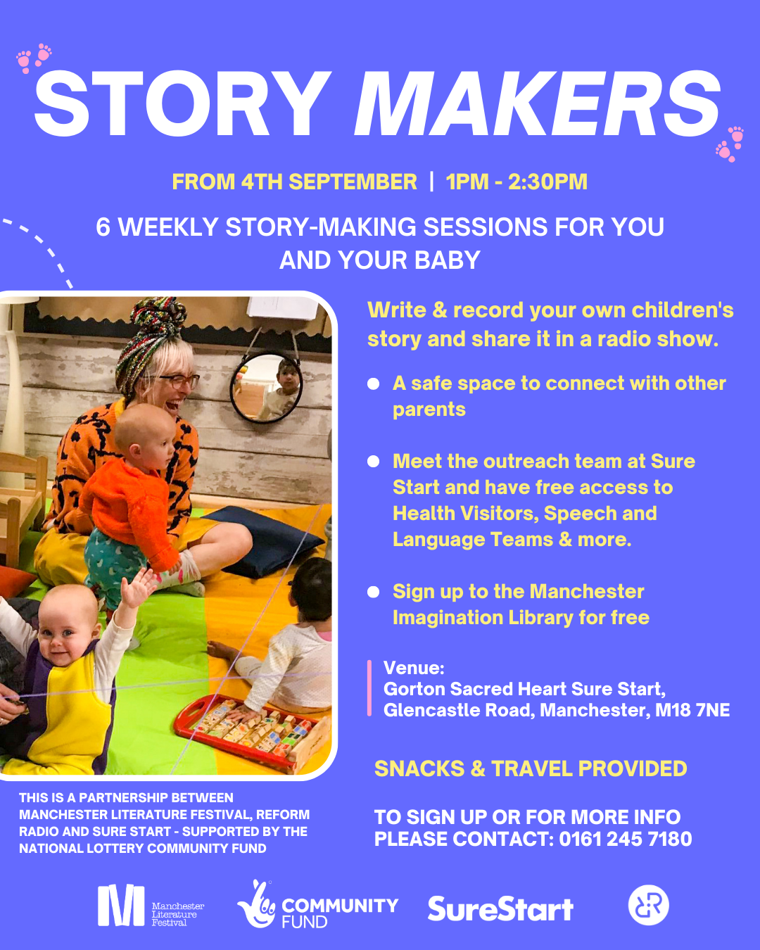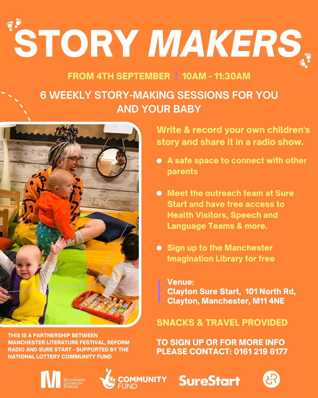 Story Makers is a free, six-week, story-making course for parents and babies. The project will involve parents creating a new story through creative writing to be recorded with Reform's portable studio equipment. This is an opportunity for parents with similar aged babies to socialise and share common wisdom in a safe space.