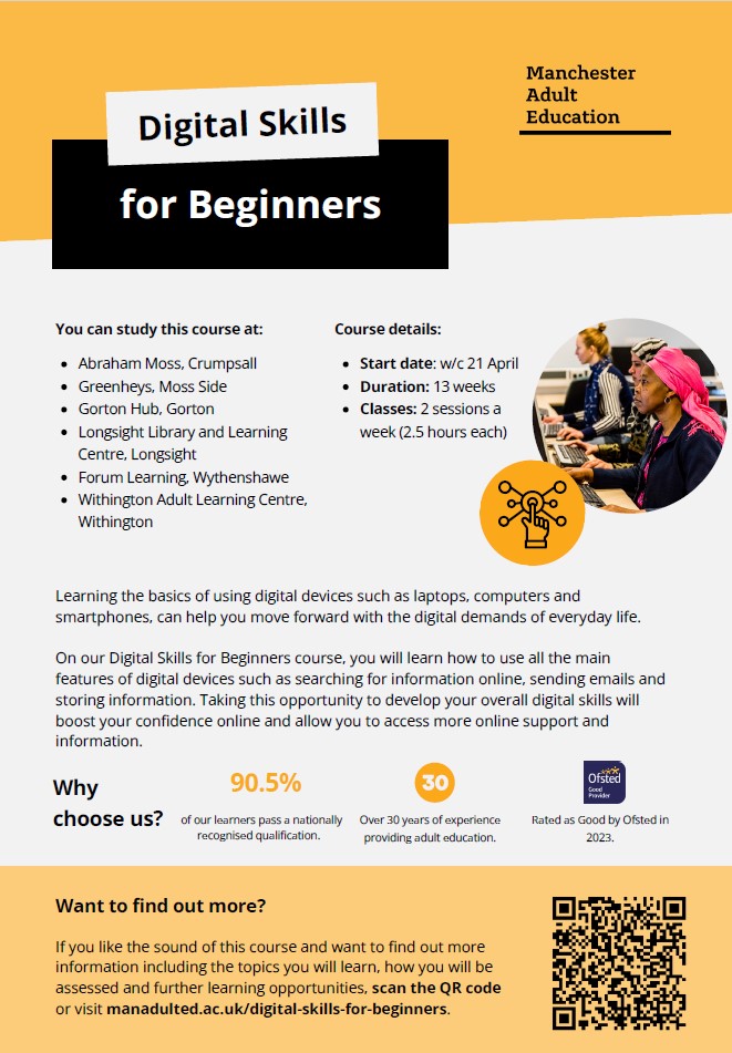 Digital Skills have become a part of everyday life. On this course, you will learn how to use all the main features of digital devices such as searching for information online, sending emails and storing information. Taking this opportunity to develop your overall digital skills will boost your confidence and allow you to access more online support.