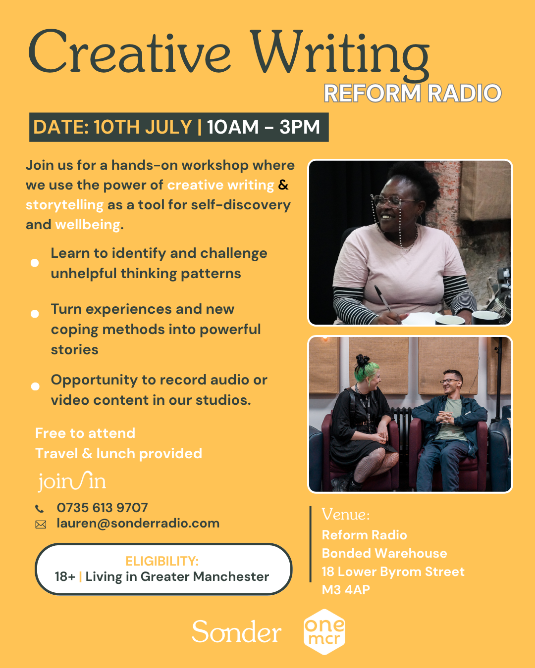 Sonder Radio is a community radio station for the 50+ demographic in Greater Manchester. Founded in 2016, their key aims have been to promote wellbeing, reduce isolation and advocate digital inclusion. They achieve this by running various creative workshops and connecting people through the content made by the community at Sonder. They encourage people at all skill levels to take part in their workshops, as they are catered to help teach and guide every participant from the ground up. They pride themselves on not leaving anyone behind. There is always, in every person, the capacity to learn something new and at Sonder Radio they hope to provide that experience for everyone that gets involved.