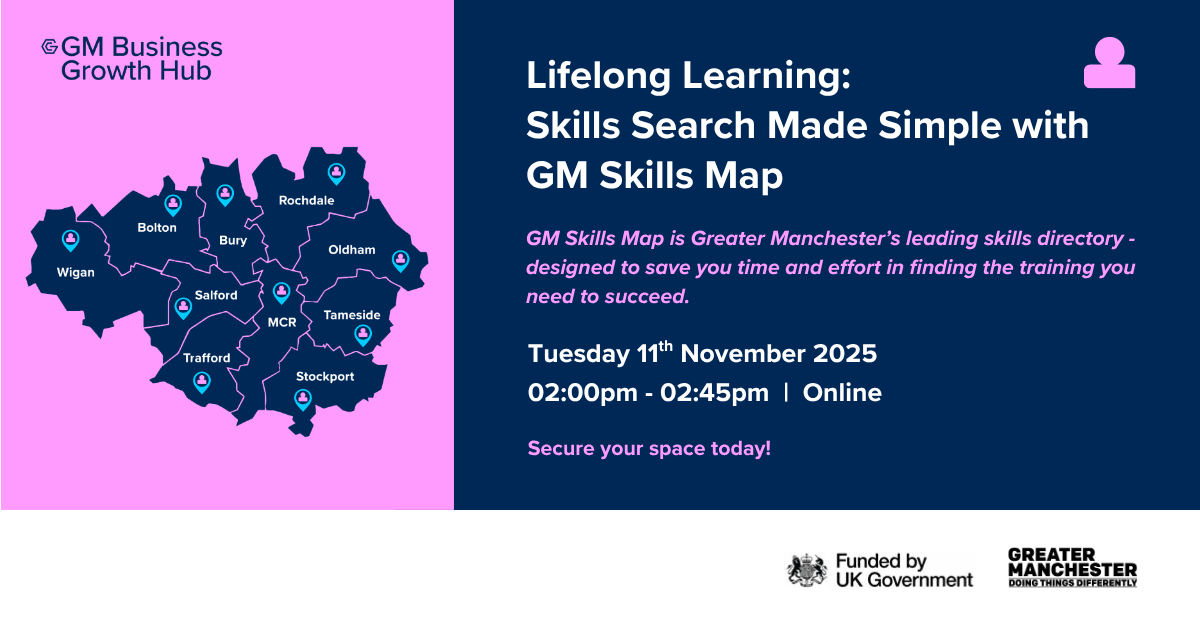 GM Business Growth Hub, Greater Manchester’s Business Support Organisation, is encouraging Greater Manchester to strengthen their skills position and take control of free skills solutions and dedicated support to overcome their barriers to learning, solve workplace pain points to achieve skills success.