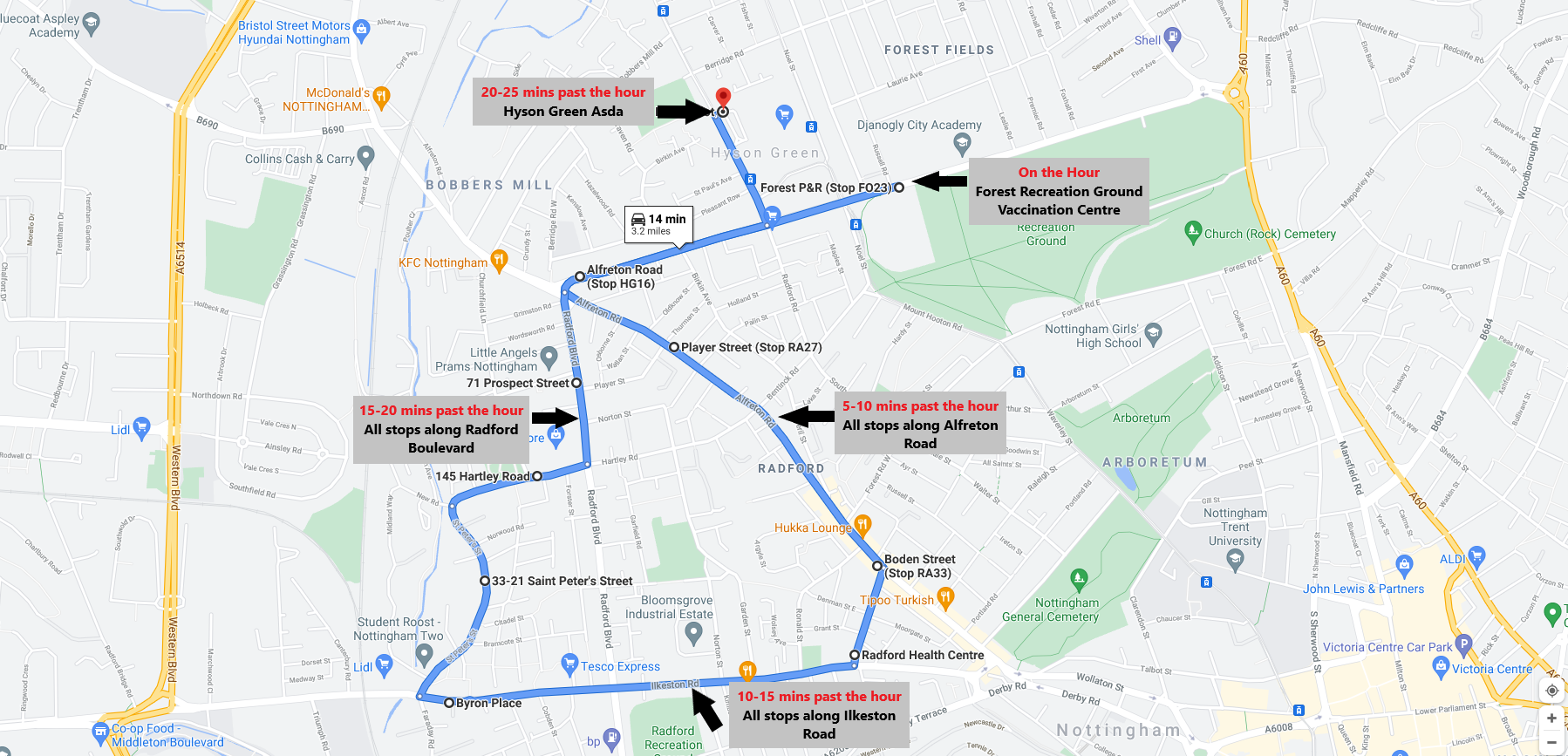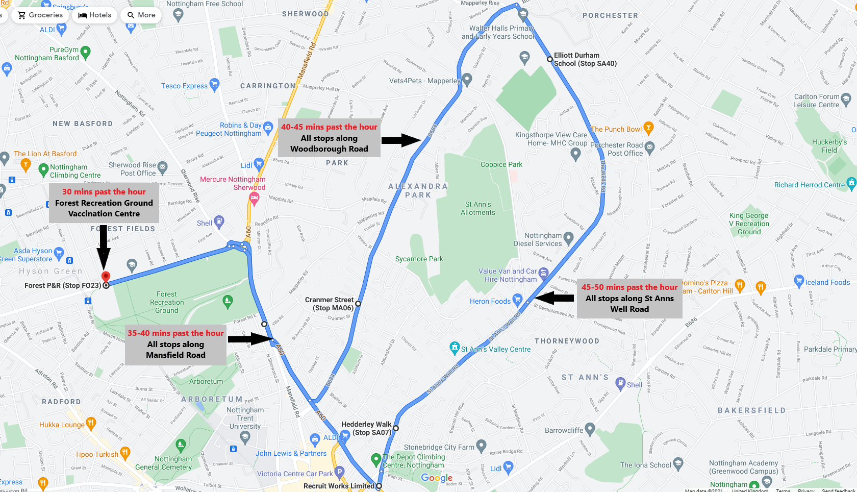 The vaccination centre will offer Pfizer-only jabs on those days. A free shuttle bus will run to Forest Rec in an hourly-loop around Radford, Arboretum, Hyson Green and St Ann’s.