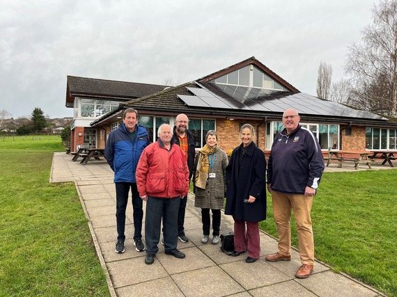 Image Description: From left to right: Richard Utting: Chair of Penrith Lottery, Michael Eyles: Westmorland and Furness Cllr. for Penrith South, Cllr. Doug Lawson: Penrith Town Council Chair & Penrith Mayor, Valerie Bowen: Penrith Town Council Pategill Cllr. & Deputy Chair of Communities Committee, Cllr. Virginia Taylor: Westmorland and Furness Cllr. for Penrith South and Cabinet Member for Sustainable Communities and Localities, Charles Graves: Past President of Penrith Rugby Club. The solar panels are pictured behind the group.