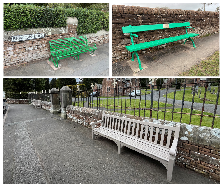 The Council is pleased to report that it has repainted a number of benches on Beacon Edge, helping to keep the area looking welcoming and well-maintained. This includes two benches near the cemetery, the distinctive green bench opposite Wordsworth Street and the Girl Guides Bench close to the Roundthorn junction.