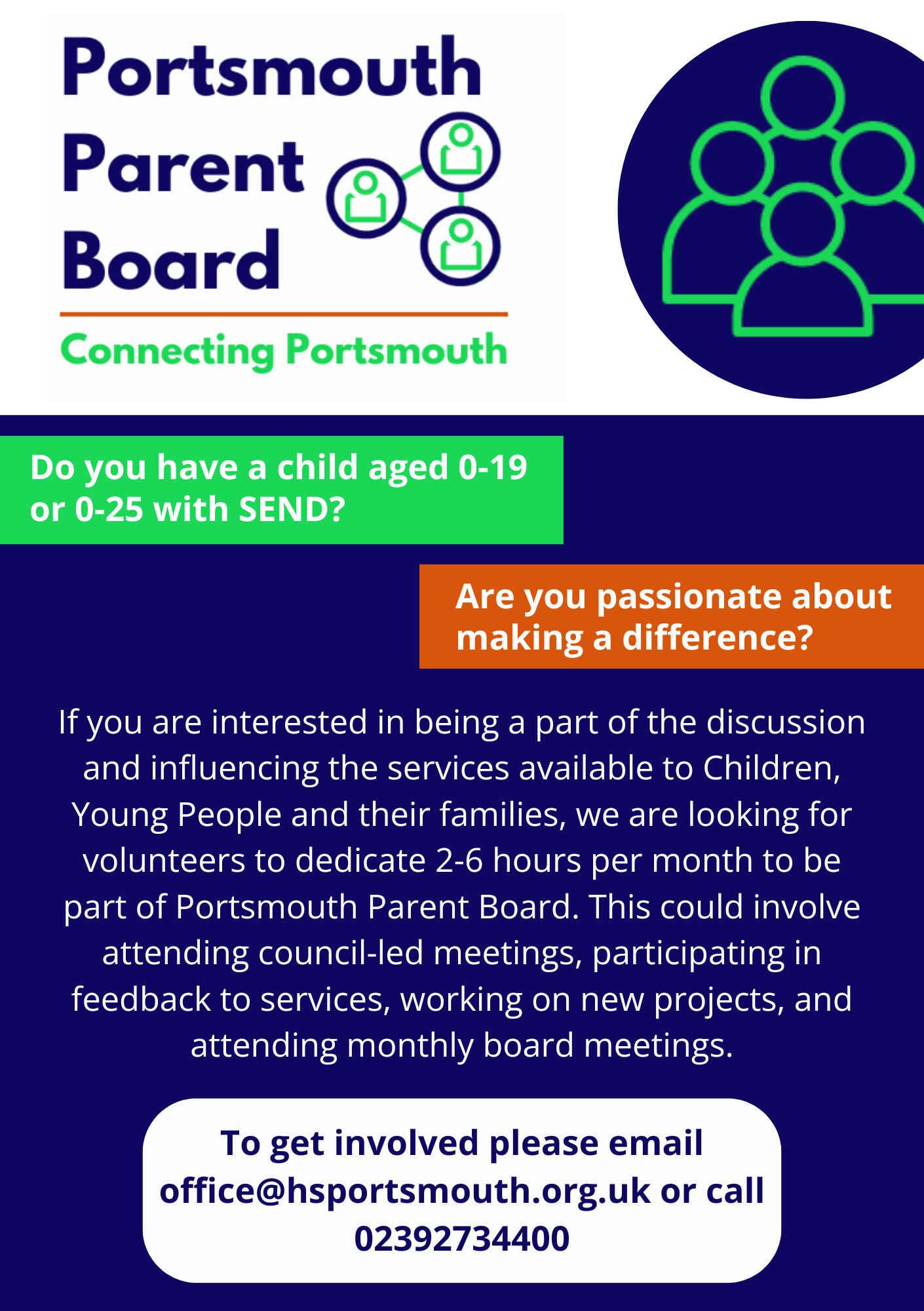 For further information, please visit the Portsmouth Parent Board website, phone 023 9273 4400 or email office@hsportsmouth.org.uk.
