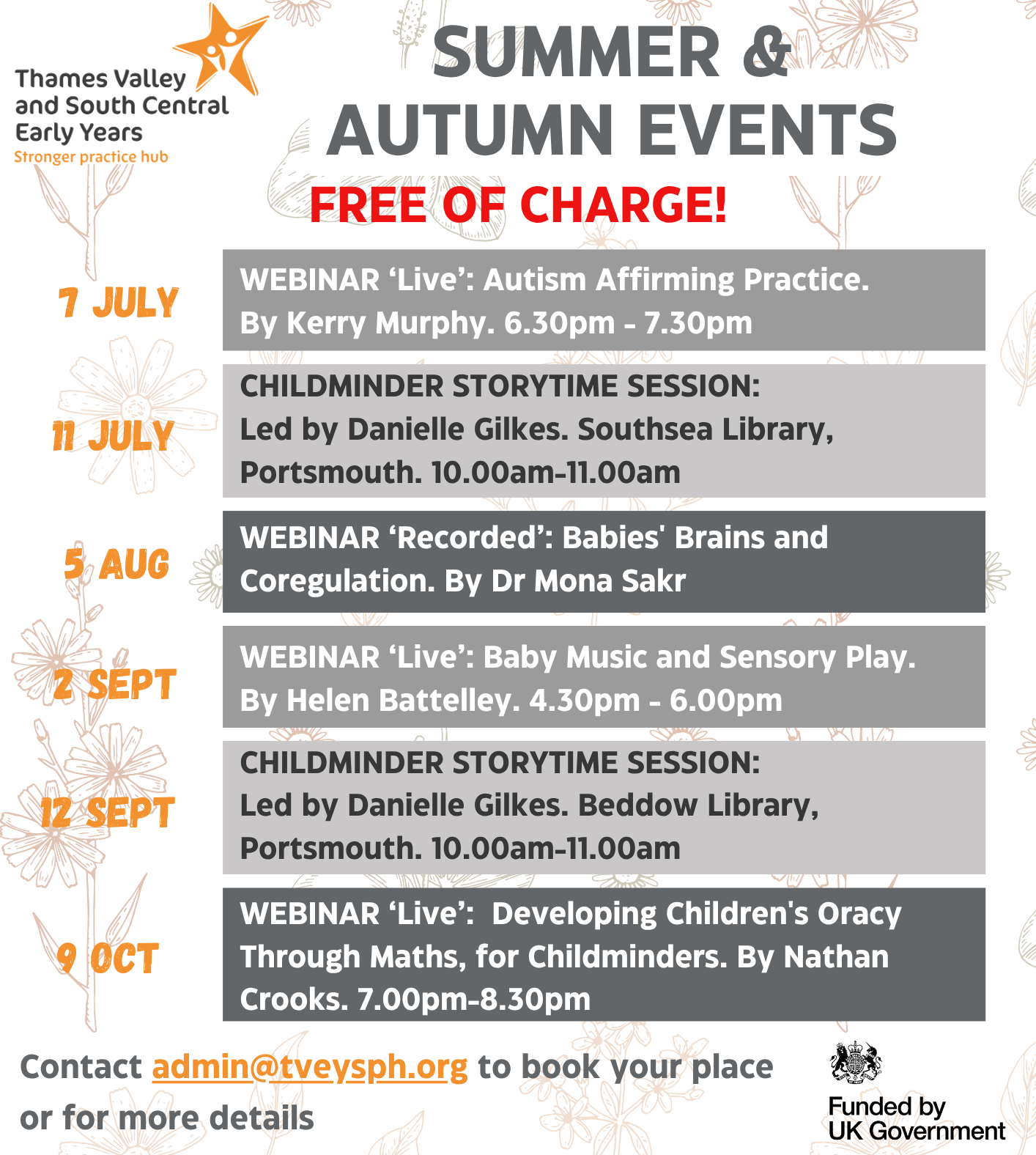 Take a look at the poster at the button below showing the free summer and autumn event from Thames Valley and South Central Early Years Stronger Practice Hub. Contact admin@tveysph.org to book your place of for more details.