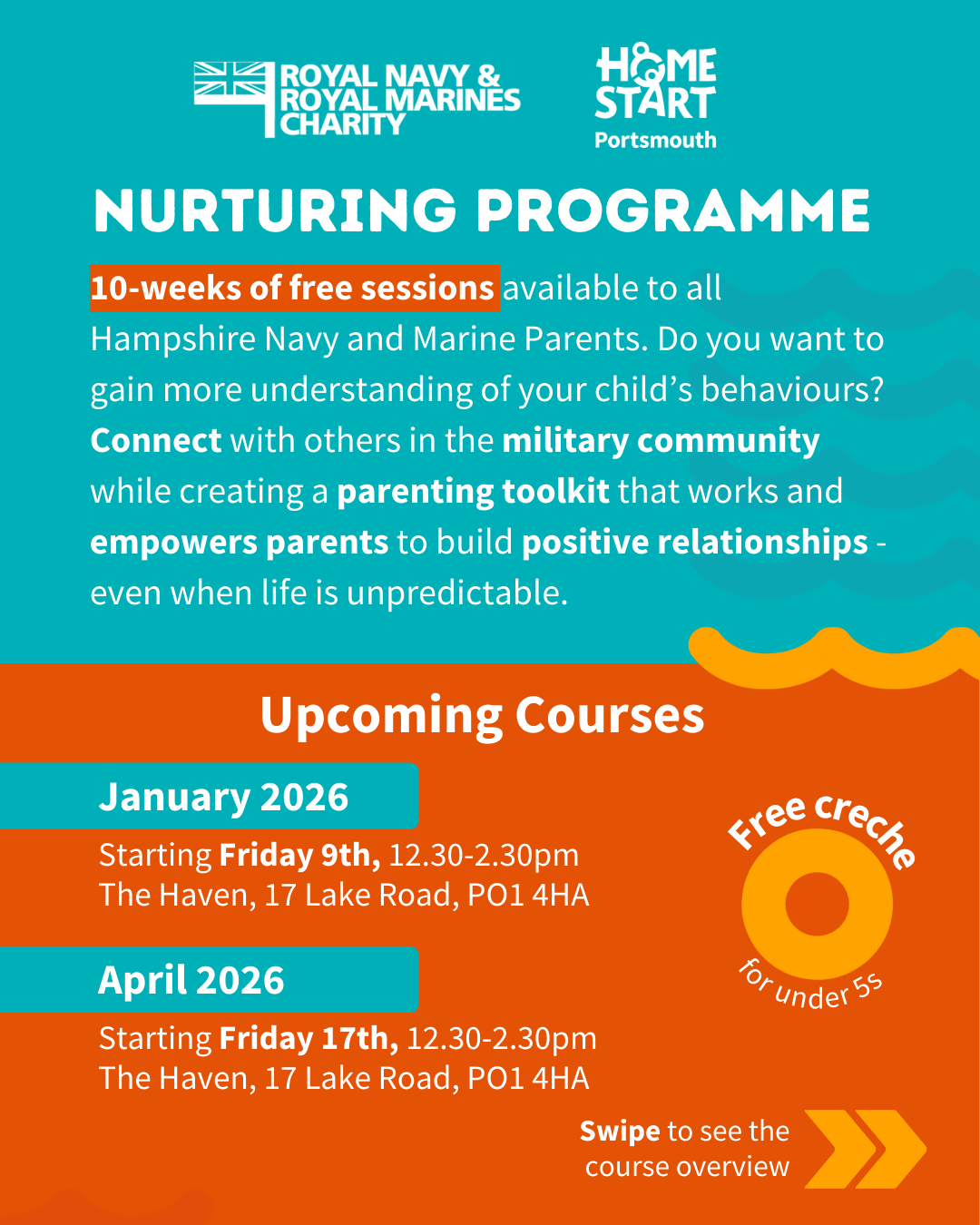 It’s an opportunity to connect with other military parents, share stories, and develop practical tools that help family life thrive… even when things feel unpredictable. A free crèche is available for children under 5.
