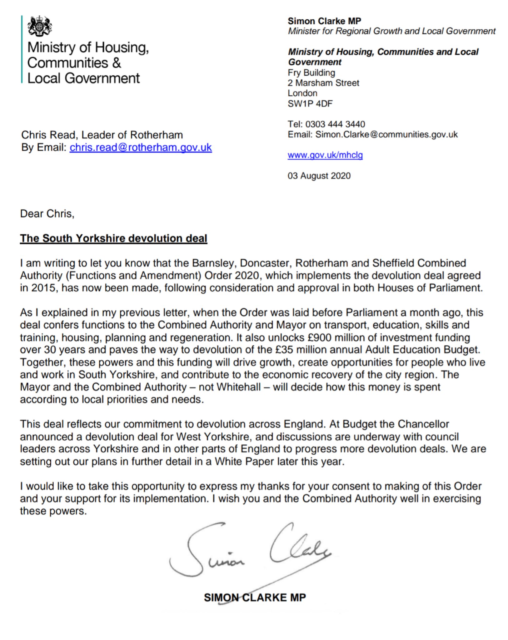 The final go ahead for the devolution deal was confirmed in a letter from Simon Clarke MP, Minister for Regional Growth & Local Government to Councillor Chris Read, Leader of Rotherham Council.