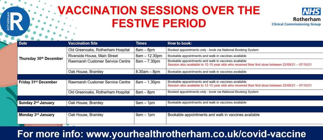 Vaccination sessions are still happening across Rotherham over the New Year. Whether you need your first, second or booster doses, there are appointments and walk-in sessions available.