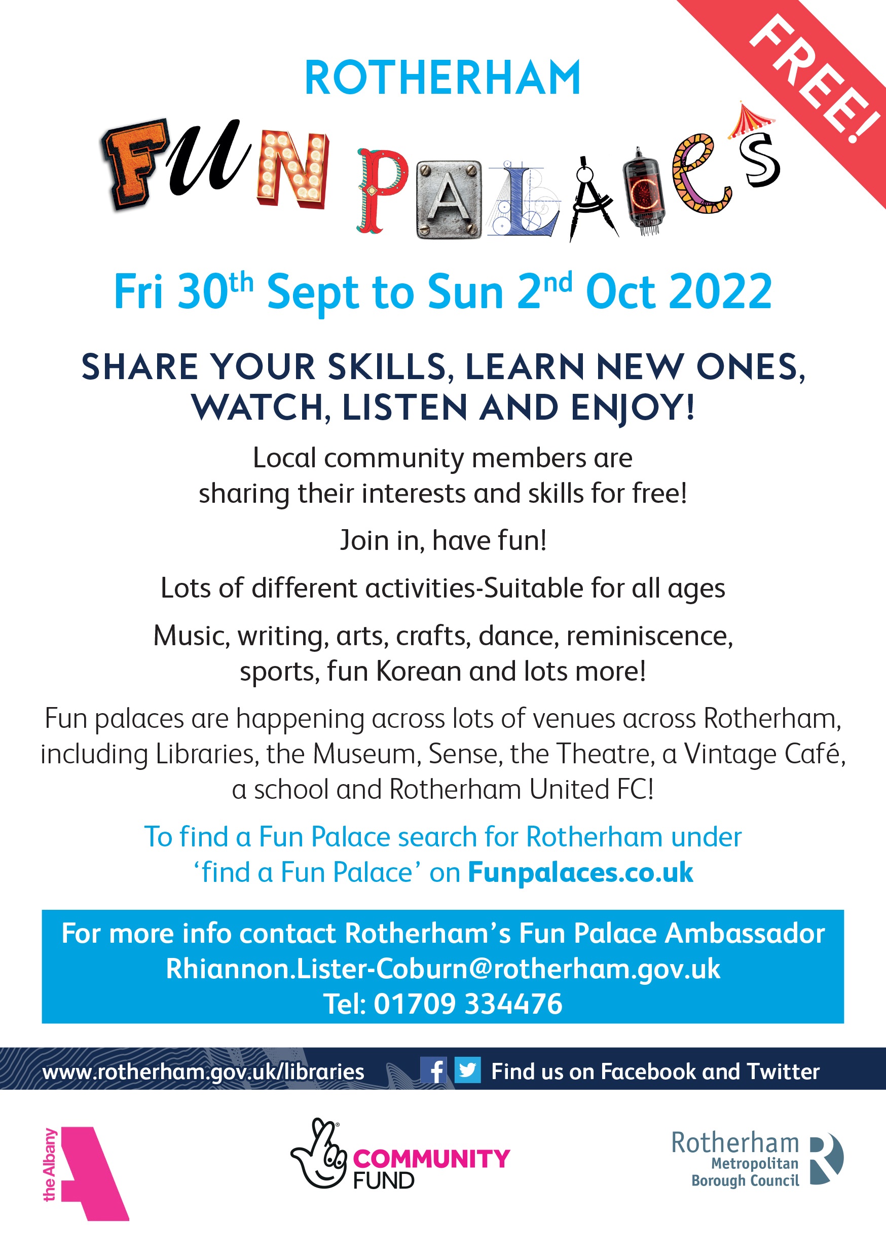 - Friday 30 September to Sunday 2 October 2022, drop-in, Rotherham Fun Palaces events - share your skills, learn new ones, watch, listen and enjoy! Come and try free activities across Rotherham, music, arts, writing, flower arranging, drama, join in, have fun! All ages welcome. Activities will be taking place at lots of venues across Rotherham including Libraries, Clifton Park Museum and the Theatre. Find out more information - Read the Fun Palaces leaflet here or visit www.funpalaces.co.uk and enter 'Rotherham' in the search button to find events in Rotherham.