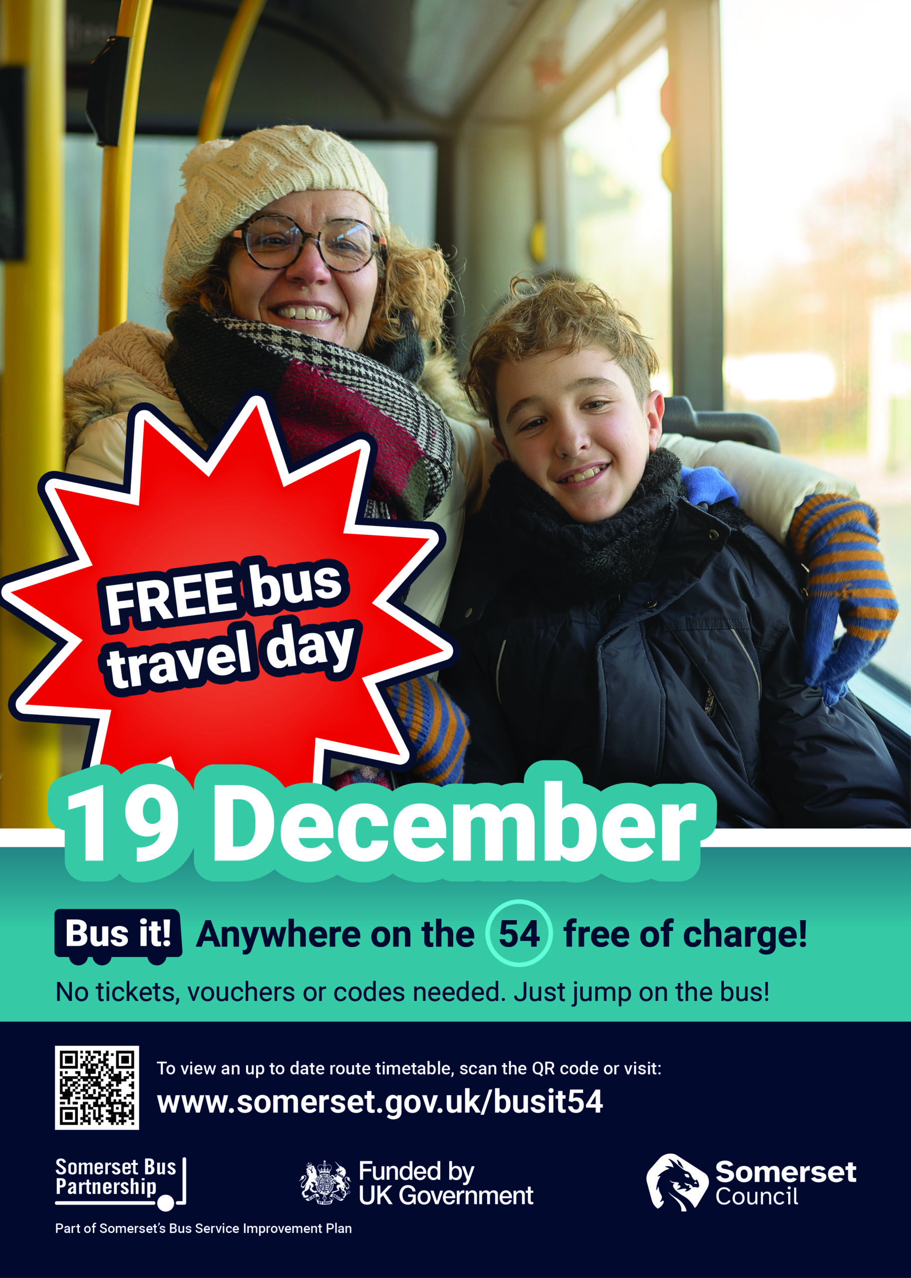 Working in partnership with Somerset Council and the Somerset Bus Partnership, First Bus South, which operates Buses of Somerset is offering a free travel day on the 25, 28, 54 and 58/58A services all day on Tuesday 19 December.