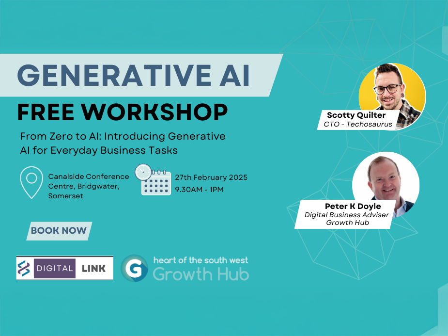 Join the Growth Hub’s free AI workshop for SMEs, Micros, and Sole Traders at The Canalside Conference Centre in Bridgwater from 9.30am to 1pm on 27 February to learn how AI can support HR, Sales, Marketing, and Finance, streamline tasks, enhance productivity and give your business a competitive edge.