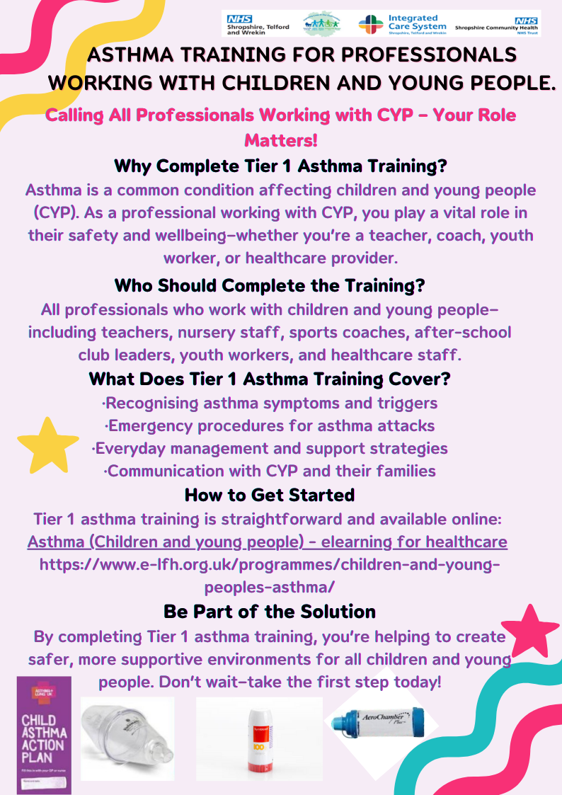 https://www.e-lfh.org.uk/programmes/children-and-young-peoples-asthma/ The Tier 1 training is designed to provide essential knowledge and skills for professionals who work with children and young people, to better manage and support those with asthma. The online module takes 30-45 mins to complete and you gain a certificate.