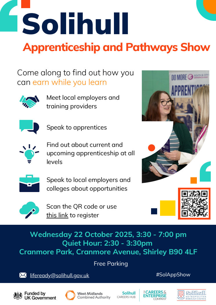 The Solihull Apprenticeship and Pathways Show is an event to help Year 10-13 pupils learn about alternative routes after GCSE such as apprenticeships, Internships and T Levels.