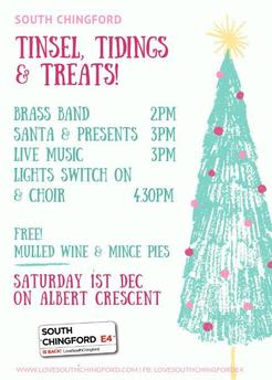 Tinsel, Tidings and Treats will be on offer on Saturday 1 December when Love South Chingford hold its annual Christmas event in Chingford Mount starting at 2pm with the St Edmunds Brass Band, then at 3pm fresh from the North Pole Santa will arrive with free presents for the children. Chris Deering, local DJ, will provide live music through until 4.30pm when local veteran Maurice will start the countdown to switching on the Christmas Tree lights.