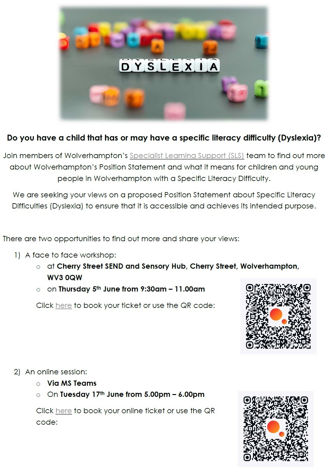 SEN Support: 5 June 10:00am to 12:00pm at Warstones Primary School (Warstones Road, WV4 4LU).
