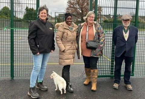 L-R District Councillor Janine Lewis, Executive Portfolio Holder for Public Health, Culture, Leisure, Sport and Countryside, June Felix of Koolplay Ltd, Parish Councillor Theresa Downes, Vice Chairman of Tilehurst Parish Council and project lead, and Parish Councillor Clive Taylor, Chairman of Tilehurst Parish Council