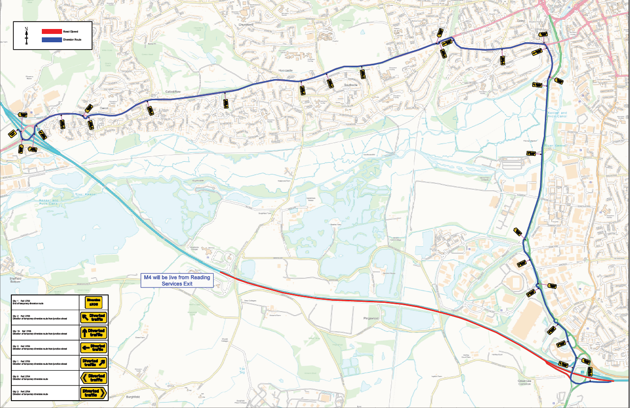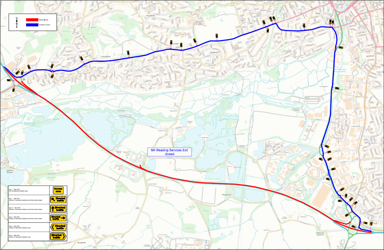 During these closures, signed diversions will be in place via M4 J12, onto A4, A33 and back on the M4 via J11 as per map below.
