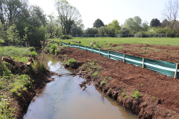 Above: sheeting has been put up along the course of the Emm Brook to keep mud from the site away