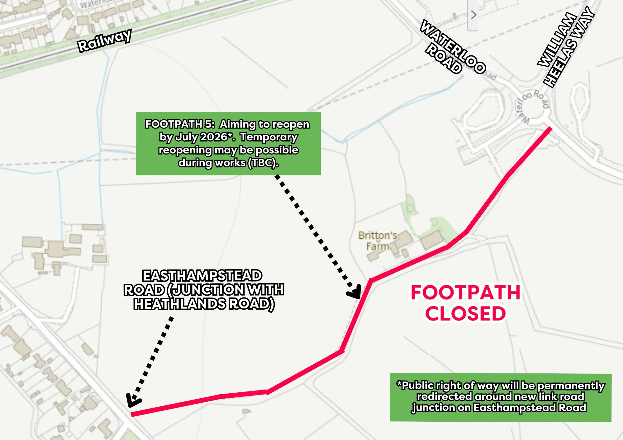 Now to July 2026 - Footpaths along the route of the new road temporarily closed. See below for in-depth explanation and timings