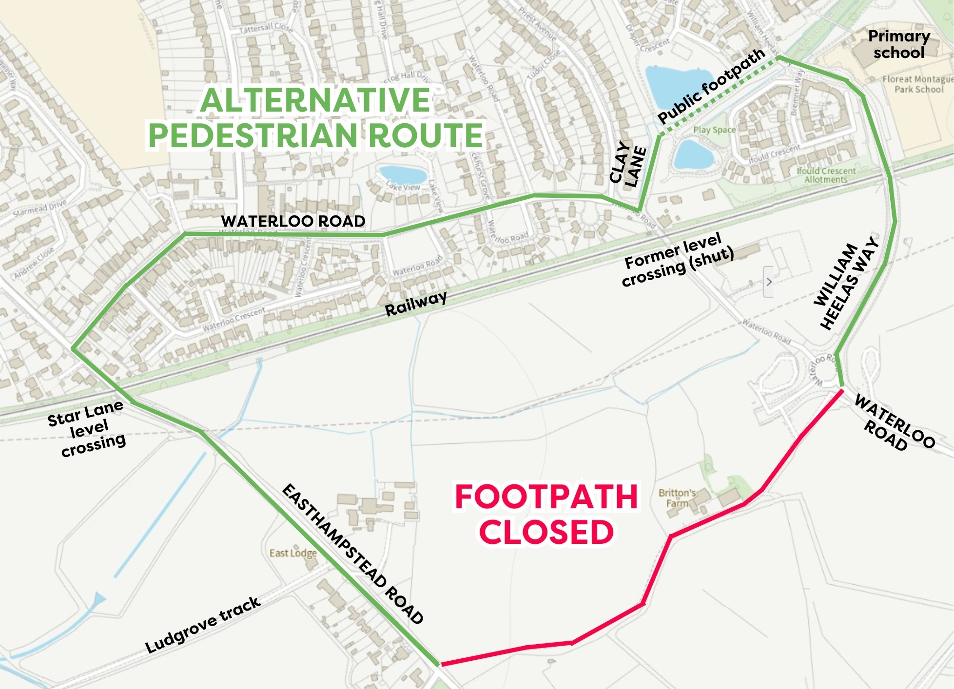 All footpaths north of the Ludgrove track, between Finchampstead Road and Easthampstead Road, are now closed with diversions via surrounding streets.