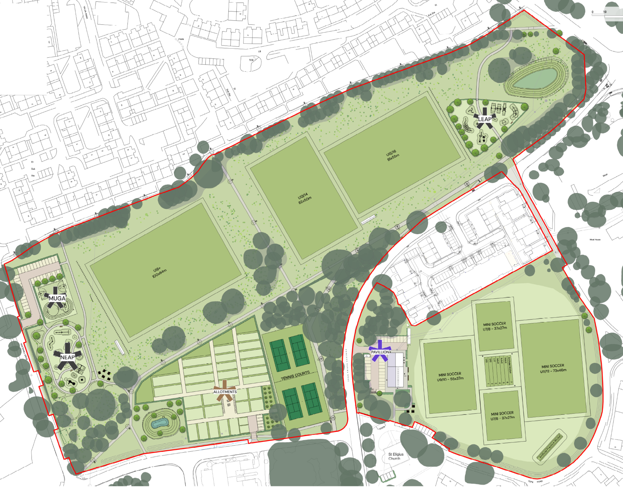 This would include a grass sports pitch and another with artificial grass, plus a sports pavilion, allotments, informal kick-about area and a BMX track and playground.