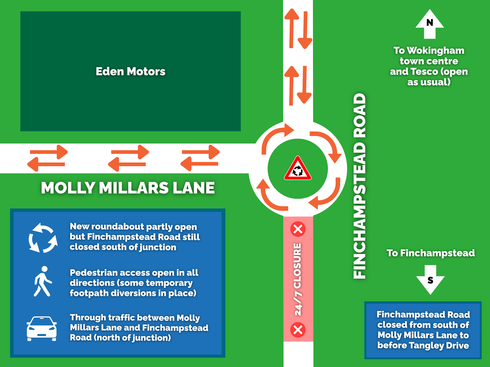 - Early 2026 – Finchampstead Road (south of junction) will be closed with diversions in place. Traffic will continue to flow between Molly Millars Lane and Finchampstead Road (north of junction) only, with pedestrian access and footpath diversions. There will be a period when the new roundabout will be open, but still closed south of the junction