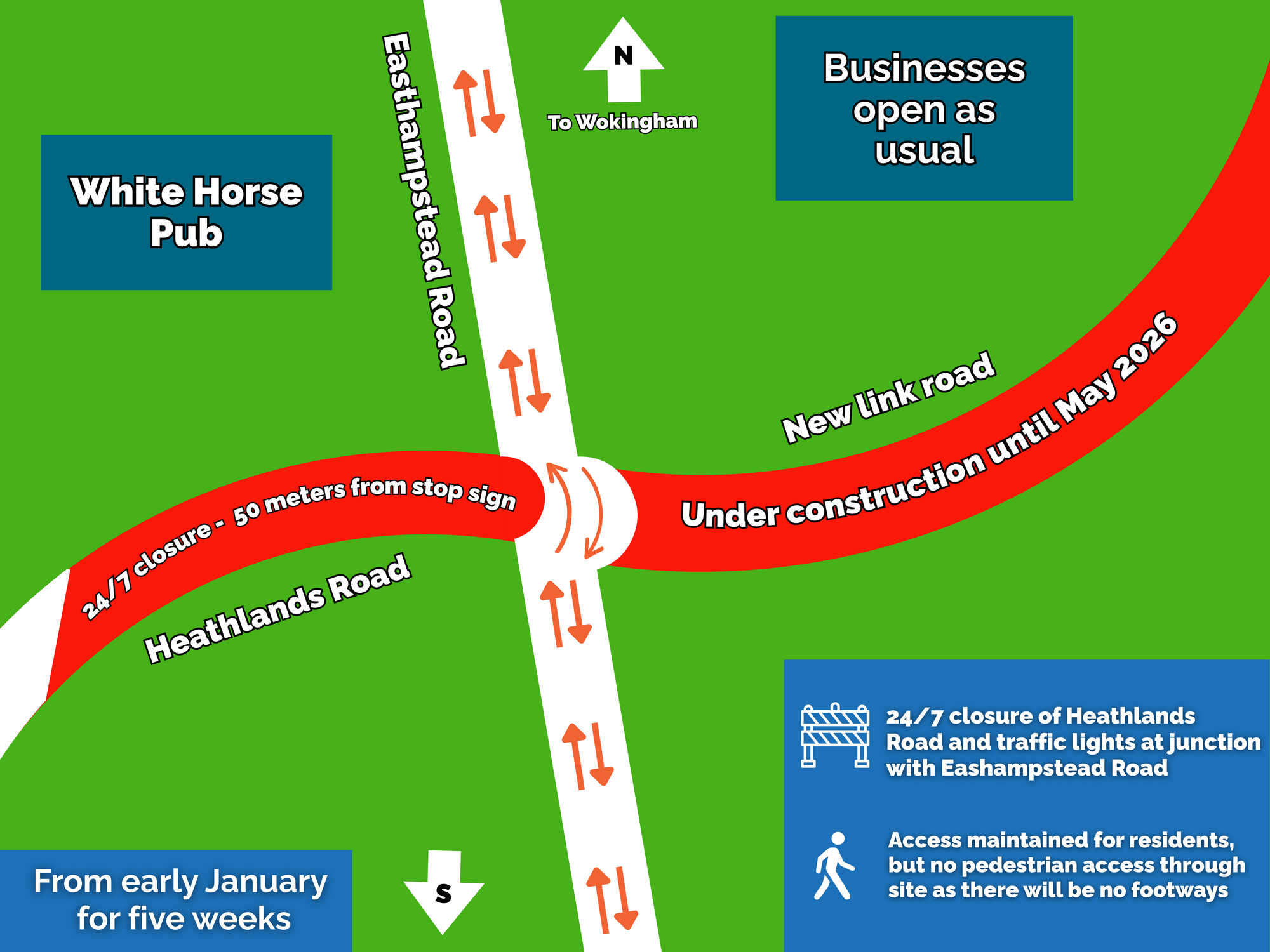 During the five-week closure of Heathlands Road at the junction with Easthampstead Road, the diversion route will be as follows.