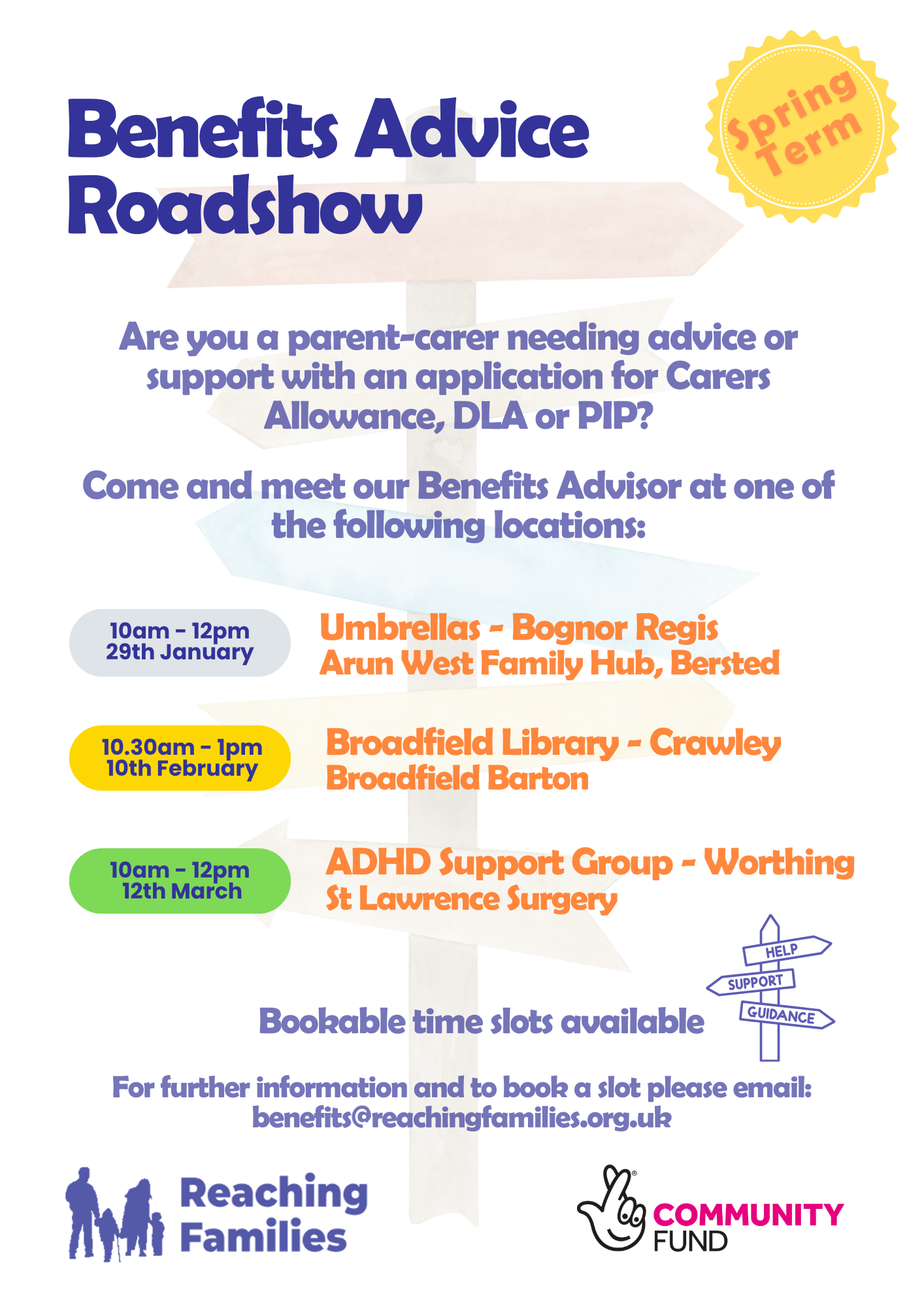 Parents of a child or young person with SEND can meet our Benefits Advisor in their local area for support with applications for Carers Allowance, Disability Living Allowance and Personal Independence Payment.