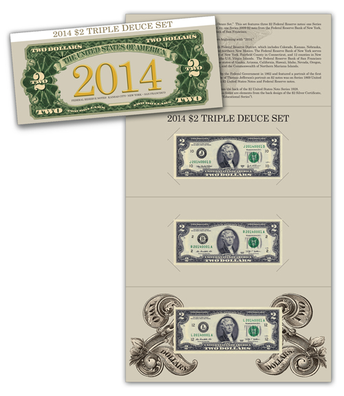 (First Day of Sale - May 13, 2014- 8:00 A.M. ET) - The Bureau of Engraving and Printing proudly presents the "2014 $2 Triple Deuce Set." Limited to 3,000 sets worldwide, this set features a Series 2003A $2 note from the Federal Reserve Bank of Kansas City, a Series 2009 $2 note from the Federal Reserve Bank of New York and a Series 2009 $2 note from the Federal Reserve Bank of San Francisco. Each note features matching serial numbers beginning with “2014.”