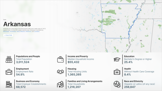 Explore Census Bureau data about Arkansas as we celebrate its anniversary of statehood. Learn more about the state using data profiles and other interactive data tools.