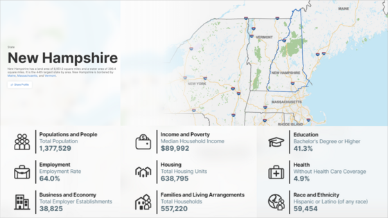 Explore Census Bureau data about New Hampshire as we celebrate its anniversary of statehood. Learn more about the state using data profiles and other interactive data tools.