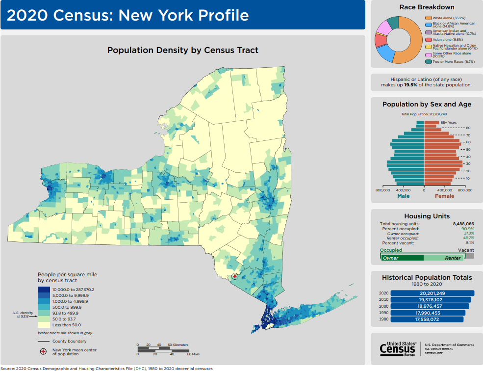 New York was the 11th state to join the Union and had a population of 20,201,249 in 2020 – an increase of 4.2% from 2010.