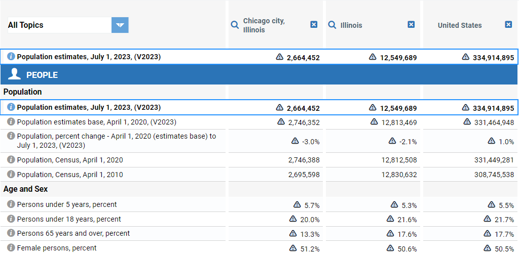 Get statistics for all states and counties, and cities and towns with a population of 5,000 or more, with QuickFacts.