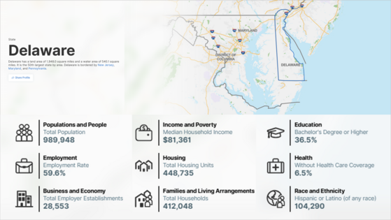Explore Census Bureau data about Delaware as we celebrate its anniversary of statehood. Learn more about the state using data profiles and other interactive data tools.