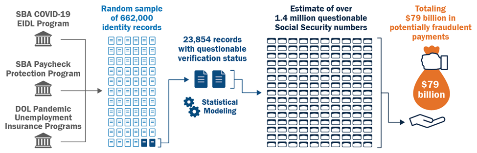 SSA’s verification process flagged nearly 24,000 of the 662,000 sampled records as potentially fraudulent—either the SSN was never issued or didn’t match the applicant’s name or date of birth, indicating that they were either stolen or being used without authorization. Based on those results, our data scientists used statistical modeling to estimate how widespread these issues were in the full set of pandemic relief applications. The analysis suggests that around 1.4 million applications used potentially stolen or invalid SSNs, leading to over $79 billion in potentially fraudulent payments.