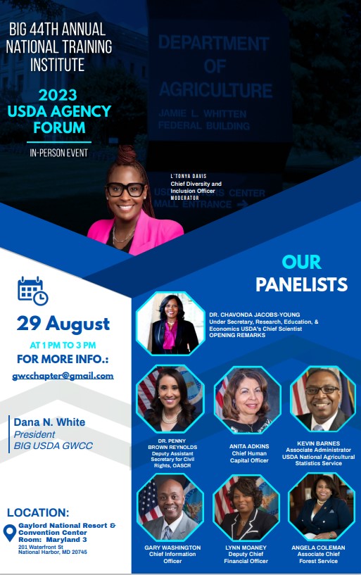 The USDA George Washington Carver Chapter of Blacks in Government (BIG) is having a USDA forum on August 29, from 1pm - 3pm ET. This event will be held in-person at the Gaylord Resort and Convention Center at the National Harbor in Maryland. A registration fee is required for this part of the conference so you must register to attend. For more information contact: gwcchapter@gmail.com.