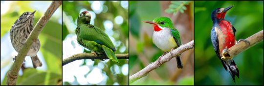 De izquierda a derecha: Reinita de bossque enano (Setophaga angelae), Cotorra Puertorriquena (Amazona vittata), San Pedrito (Todus mexicanus) y Carpintero de Puerto Rico (Melanerpes portoricensis).