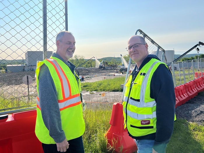 Bryan Bower, West Valley Demonstration Project director, left, and Stephen Bousquet, West Valley assistant director of project management, observe the cover installation over the footprint of the Main Plant Process Building. Completion of the Main Plant demolition has significantly altered the landscape of the site.