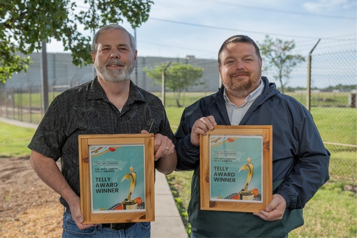Four Rivers Nuclear Partnership Information Technology Specialist and Drone Pilot Jim Reason, left, and Public Affairs Manager Dylan Nichols pose with their Gold Telly Awards. The duo was responsible for the production of last year’s water tower demolition video.