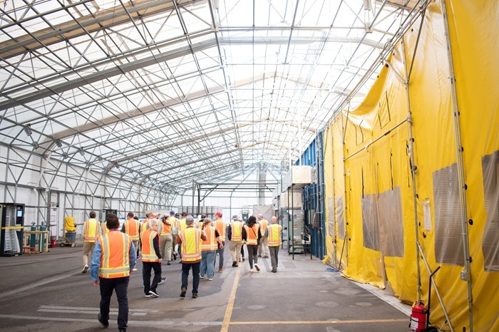 Inside Dome 231 at Technical Area 54 (TA-54), Area G, Los Alamos National Laboratory, Newport News Nuclear BWXT-Los Alamos LLC senior Waste Operations staff provided an overview of key activities. Attendees learned about the restoration of a pit after the retrieval of corrugated metal pipes containing cemented transuranic waste, waste characterization and certification, operations to remove items from transuranic waste drums that do not meet the Waste Isolation Pilot Plant’s waste acceptance criteria, and future cleanup work at TA-54.