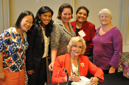 Members of the Bay Area Equal Pay Collaborative pose with Equal Pay Advocate Lilly Ledbetter (front).  From left to right: Linda Li, EEOC; Ana Victoria Fortes, Region IX Women's Bureau; Carla Collins and Esthr Perales-Deickmann, Santa Clara County Office of Women's Policy; and Joan Goddard; Coalition for Equal Pay.