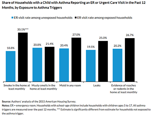 The Urban Institute recently published findings from the 2015 American Housing Survey, the first national survey to gather detailed housing characteristics alongside data on childhood asthma. Several key findings highlight the relationship between the home environment and asthma. Households with children that report smoke, mold and leaks in their home are more likely to have at least one child with asthma. Renters, including those with children, are more likely than homeowners to have asthma triggers in their home. Renters also are more likely to have at least one child with asthma. Smoking inside the home and the presence of mold in bedrooms are associated with more emergency room and urgent care visits among households with an asthmatic child.