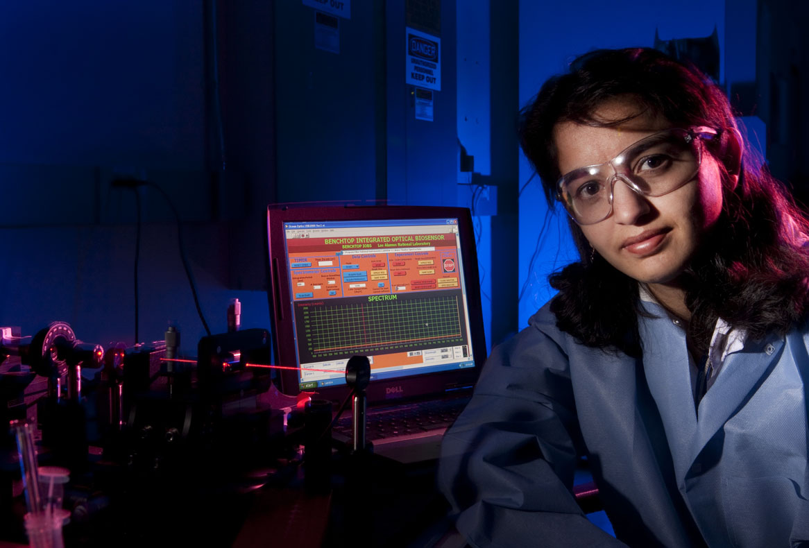 Photo caption: Los Alamos researcher Harshini Mukundan with a waveguide-based bio-sensor, the platform to be used for STEC detection.