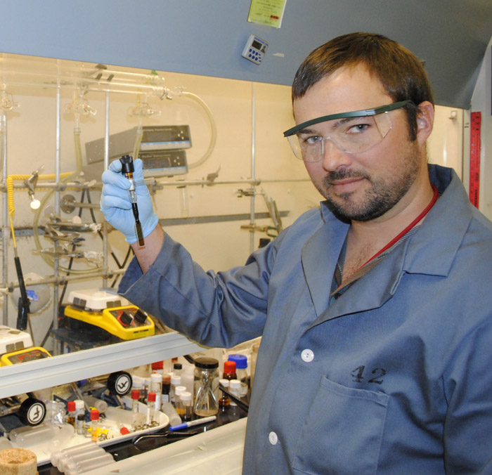 - Photo caption: Hunter McDaniel, Los Alamos National Laboratory postdoctoral researcher, works in the laboratory developing next-generation quantum dots that could revolutionize photovoltaic technology. Los Alamos National Laboratory image.