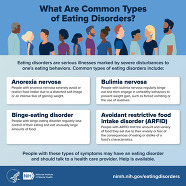 This infographic describes common types of eating disorders, including anorexia nervosa, binge-eating disorder, bulimia nervosa, and avoidant restrictive food intake disorder (ARFID).