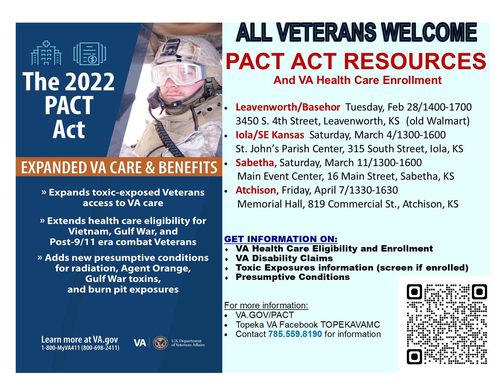The Topeka VA Medical Center will be hosting a PACT Act Resource event. During this event, Veterans will receive resources on the PACT Act and VA Health Care enrollment. The location of this event will be Memorial Hall, 819 Commercial St., Atchison, KS. For more information, please call 785-559-8190.