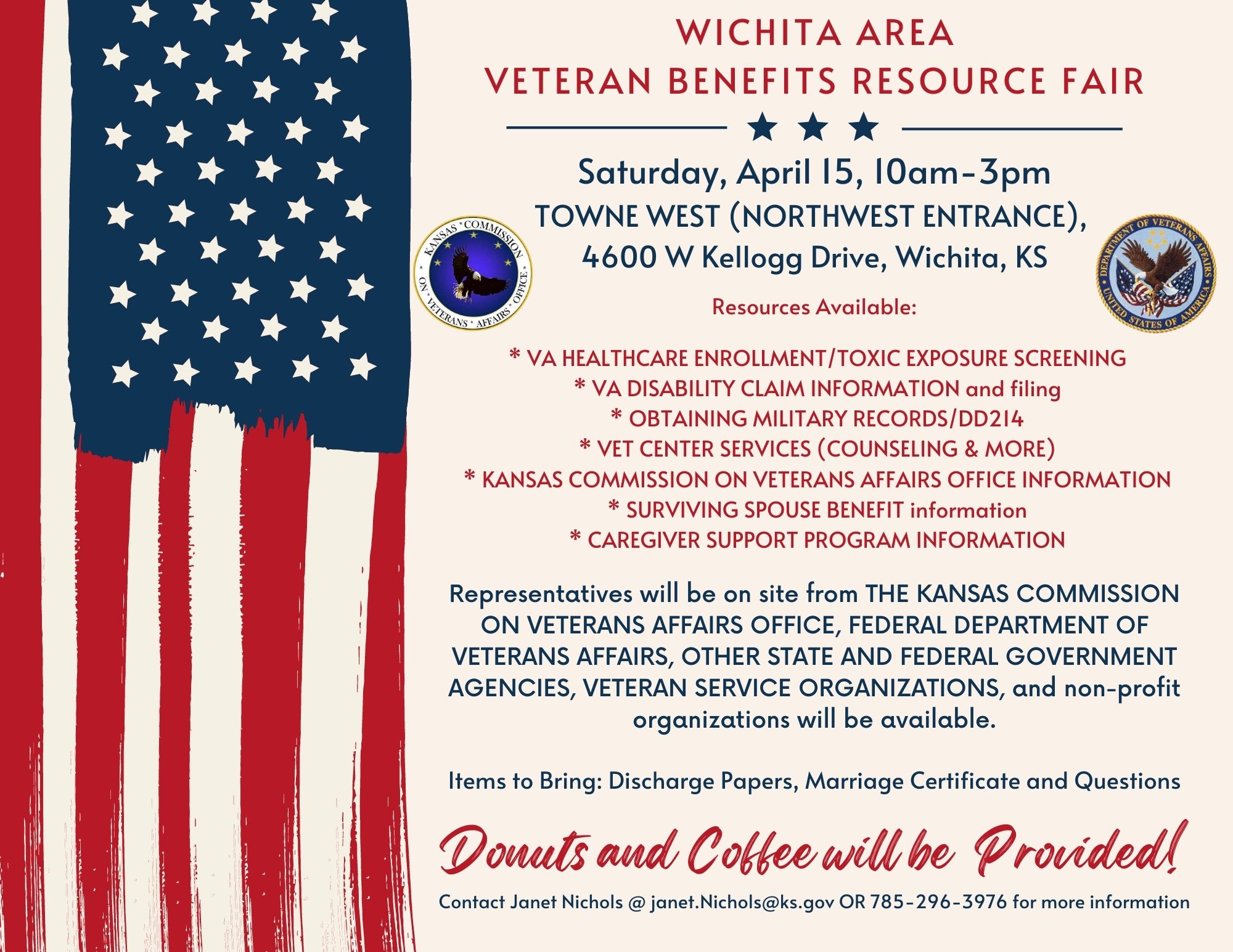 MARK YOUR CALENDARS NOW FOR APRIL 15. It doesn’t get any easier than this one-stop shop at Towne West Mall in Wichita. Contact Janet Nichols, Director of Public Affairs and Community Outreach for KCVA for more information:janet.nichols@ks.gov or by cell at 785-296-3976.