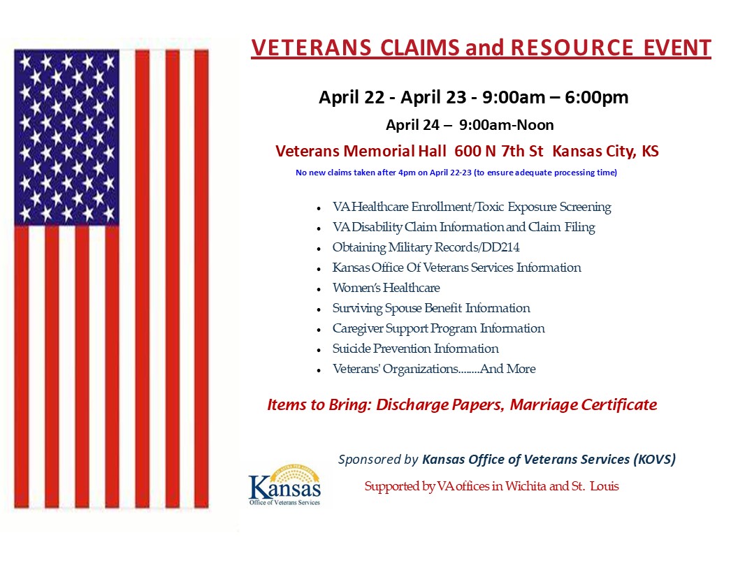 The Kansas Office of Veteran Services (KOVS), with the support of the Wichita and St. Louis VA Regional Offices, will be hosting a Veterans Claims and Resource Event at Veterans Memorial Hall in Kansas City, Kansas.
