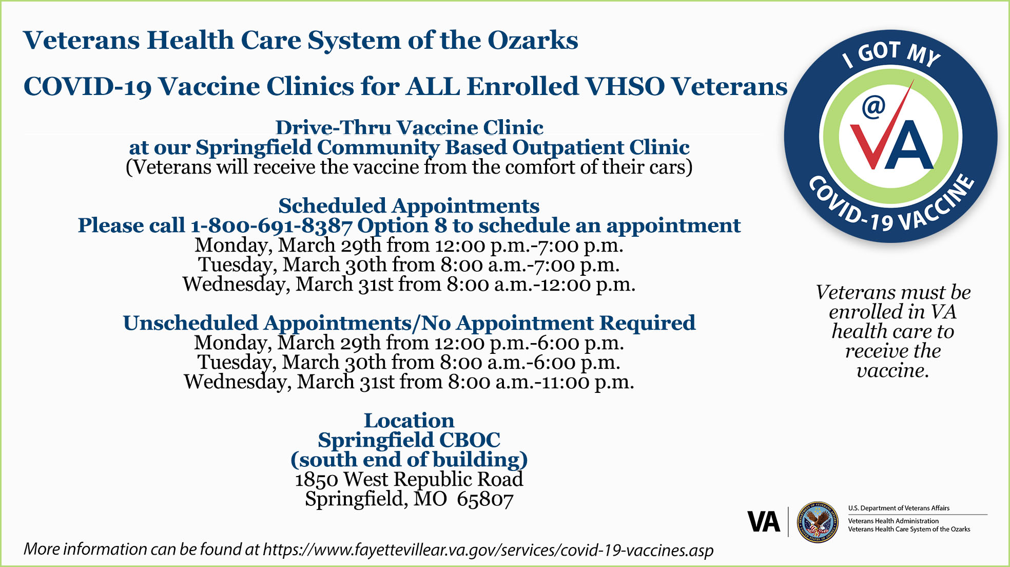 Veterans Health Care System of the Ozarks (VHSO) is proud to offer enrolled Veterans of ALL ages the COVID-19 vaccine.